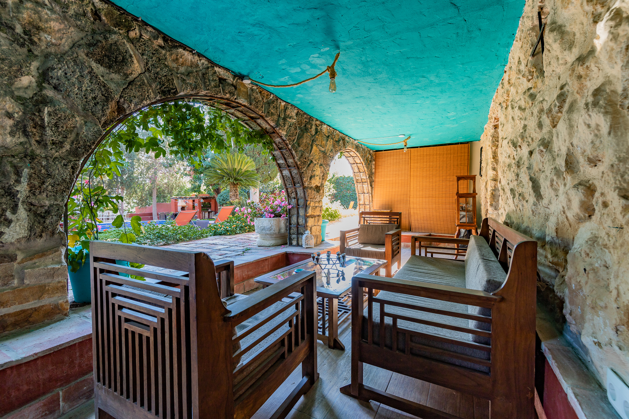 Suite de 28 M2 con ambiente inolvidable y romántico decorada con gusto y detalles que la hacen muy especial. Cuenta con cama doble tamaño King, baño privado, aire acondicionado/calefacción, minibar, caja fuerte, Wifi, Televisor Smart TV de 50 pulgadas, hervidores para té y café, secador de pelo, luz de emergencia y detectores de humo y CO2. Además incluye una zona de estar de uso exclusivo para esta suite debajo de los arcos de piedra de 24 M2 y acceso directo al jardín, gazebo y piscina.
